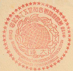 20th to 23rd June 1927. 萬國郵便聯合加盟五十年記念 Fiftieth Anniversary of Japan’s Accession to the UPU To celebrate the 50th of the Japanese accession to the UPU. A set of four special stamps were issued in Japan in relation to this. Size 35mm dia. Known colours - Red. |
