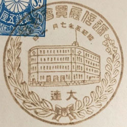 1st to 7th July 1930. 逓信展覧會記念 Communications Exhibition To celebrate a Communications Exhibition. The building is Dairen's main Telephone Exchange and Telegraph Office. The aerial on the roof probably means that the radio station also had offices there. Size 35mm dia. Known colours - red/brown. |