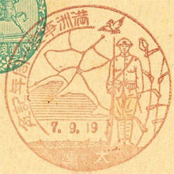 18th to 19th September 1932. 満洲事変一周年記念 reads Commemorating the First Anniversary of the Manchurian Incident. The design features a map with Mukden in the centre with a soldier, stalks of kaolin, a barbed wire entanglement and a bird in flight. This cancel has a changeable day date which can read 18th (above) or 19th. Size 35mm dia. Known colours - red