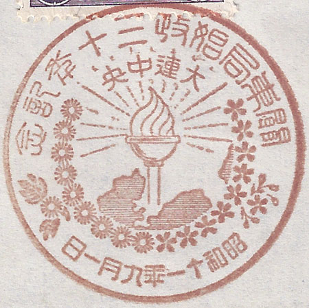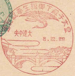 Japanese and some SMRZ Post Offices. 皇太子殿下御誕生奉祝記念 reads Commemorating Celebrating the birth of the Crown Prince. The cancel shows an Imperial Phoenix above a bridge. The date is changeable and can read 29th to 31st. This is the birth of Akihito the present Emperor of Japan (Tennō ). He was born on 23rd December 1933, son of Hirohito (Shōwa). Size 35mm dia. Known colours - red |