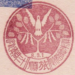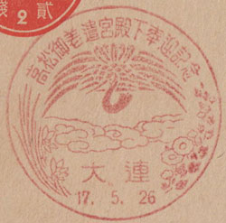 May 1942. 高松御差遣宮殿下奉迎記念 reads Welcome his Highness Prince Takamatsu. Design features - The Imperial Phoenix with auspicious clouds. Prince Takamatsu (1905 to 1987) was the third son of Emperor Taishō (Yoshihito). This cancel is very unusual because the text reads left to right, both the inscription and the Post Office name. I can find no explanation as to why they did this and as far as I know this is unique. Size 35mm dia. Known colours - red |