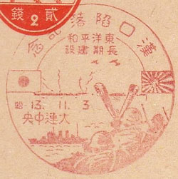 1938 支部 事變一周年記念 Marco Polo Bridge Incident First Anniversary. The cancel features Japanese flags with the Army and Navy emblems. Size 35mm dia. Known colours - red |
