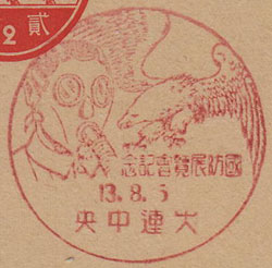 1938 國防展覧會記念 National Defense Exhibition This cancel commemorates a National Defence Exhibition. The design features a gas mask and (probably) an image representing the eagle that flew to the defence of the first Japanese emperor; Jimmu. Size 35mm dia. Known colours - red |