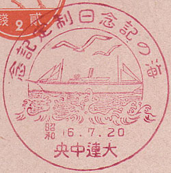 July 1942. 海の記念日reads Sea Memorial Day. Design features - a raging sea with seagulls. Size 35mm dia. Known colours - red |