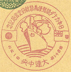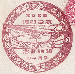 April 1929. 航空郵便開始記念 Start of Airmail Service To celebrate the start of the airmail service from Japan to Dairen - China's first international airmail service. Size 35mm dia. Known colours - red. |