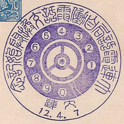 to 18th September 1925. 大連電話局自動電話交換開始記念 Opening of the New Kwantung Telephone Excahnge. Size 41mm dia. Known colours - violet. |