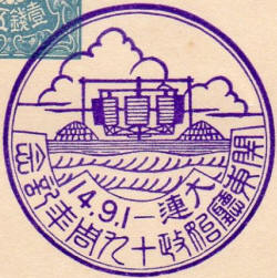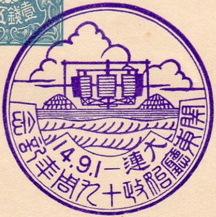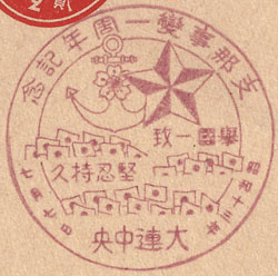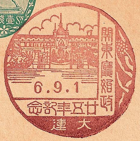 Issued 1st September 1925 This example was issued in 大連 Dairen 關東廳始政拾九周年記念 Ninteenth Anniversary of the Kwantung Prefectural Office The design features modern buildings and machines probably aimed at illustrating progress. The inscription celebrates 19 years of colonial rule. Size 35mm dia. Known colours - violet |