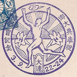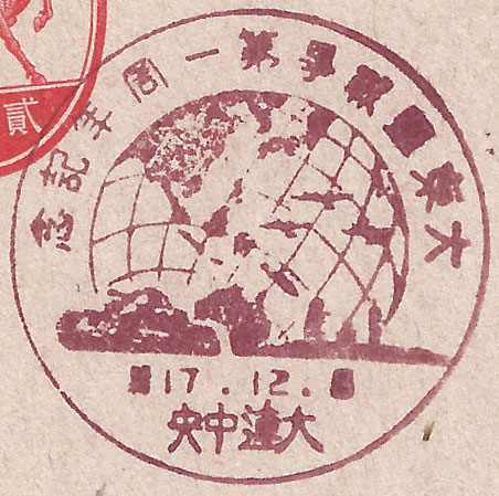 This cancel is on a Postcard showing the new building which can be seen here. Japan issued a set of four stamps to commemorate this event. According to the Encyclopedia Japanese Philately this cancel was available at all 1st and 2nd class and designated 3rd class PO's. In China this was limited to Dairen Central PO, Lushun Central PO, Mukden Central PO and Hsinking Central PO. Size 35mm dia. Known colours - red |
