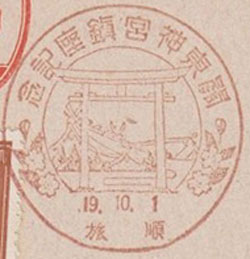 1st October 1944. The design features a Shinto Shrine at Lushun (Port Arthur). 記念関東神宮魯迅 reads Commemorate the Kanto Jingu Lushun. Size 35mm dia. Known colours - red