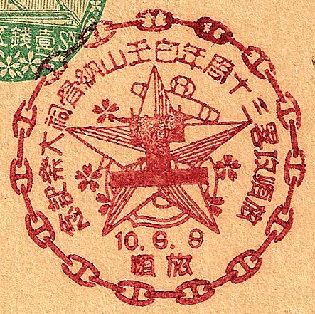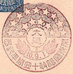 4th October 1930. 第二回國勢調査記念 Second National Census This cancel commemorates the 1930 census. The census was carried out every five years. A full census in years ending "0" and a simplified census years ending with a "5". Size 35mm dia. Known colours - red. |