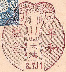 1st to 31st July 1919. 和平記念 Peace Commemoration (after WW1). This cancel was available from 15 Post Offices in Kwantung and 58 other Post Offices in China. The rams head signifies the year of the sheep in the East Asian Zodiac. Size 39mm x 35mm. Known colours - red |