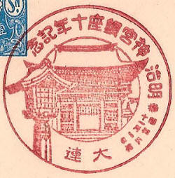 3d November 1930. 明治神宮鎮座十年記念 Tenth Anniversary of the Dedication of the Meiji Shrine 10th Anniversary of the Dedication of Meiji Shrine in Tokyo. This cancel was available from 15 Post Offices in Kwantung and 66 other Post Offices in China. Japan issued a set of 2 commemorative stamps in conjunction with this event. Size 37mm dia. Known colours - red. |