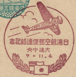 3rd to 5th November 1932. 日満航空郵便連絡記念 reads Commemorating Airmail Service Connecting Japan and Manchoukuo The Manchukuo air mail service began operation on 3rd November 1932 with airmail delivered by the Manchukuo Air Transport Company. An airmail system already existed between Japan and Manchuria operated by the Japanese, this recognises the start of the Manchurian operation of the service. This cancel was widely available in Japan, the KLT and mail SMRZ post offices in Manchukuo. This cancel has a changeable date, the right hand Chinese day date figure can read 3,4 (above) or 5. Size 37mm dia (excluding wing). Known colours - red only. |