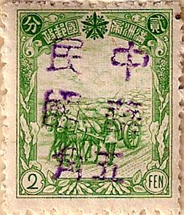 This is a four character overprint in soft violet reading 中華民國 Chinese Republic with the two character surcharge below. These are the only stamps known for this village. |