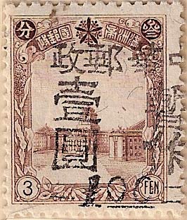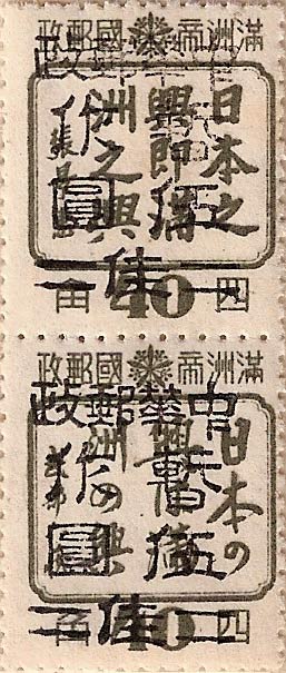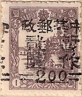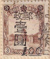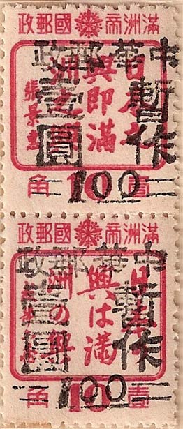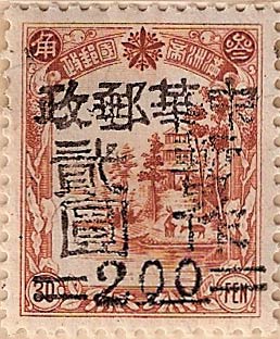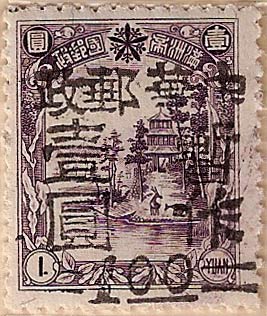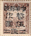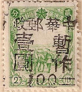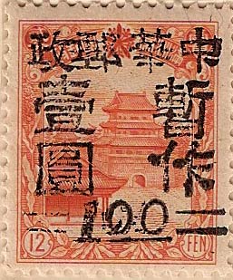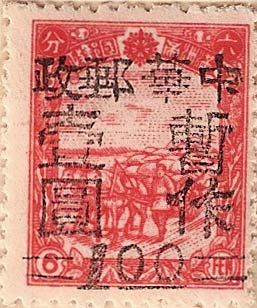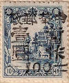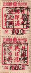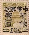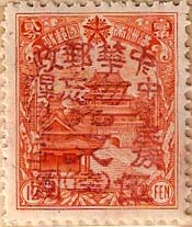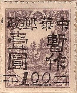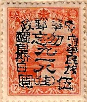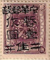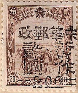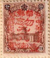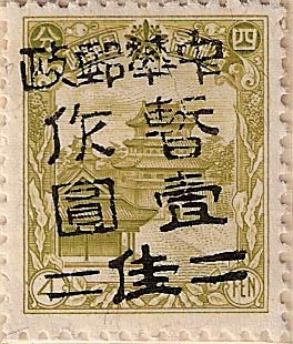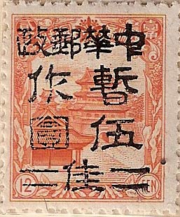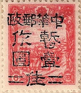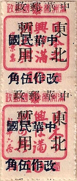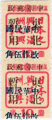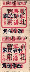This is a surcharge of 50f on the 10f rose red Chang-Chun issue. The top four overprinted characters read 中華民國 Chinese Republic, below is the surcharge followed by 作妀 Revalued. These are the only 2 stamps in this set. The Chang Chun overprint has eight characters and 10f stamps of this local issue frequently carried further surcharges made by post offices in other towns. The top four characters read 中國郵政 Chinese Post, left 暫用Temporary Use, right 北東 North East. |