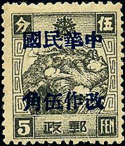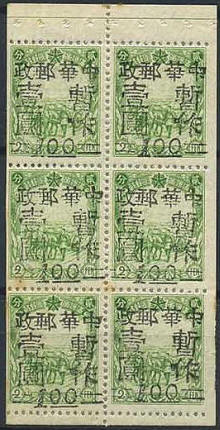 | Full set of 18 surcharged stamps. The four top characters read 中國郵政 Chinese Post, left is the surcharge and to the right 暫作 Temporary Use. Also listed are 2f and 4f booklet panes - see below. The 4f is doubtful. | ||||||||