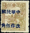 | This is a set of six surcharges all of 50f using a dark blue to blue black overprint. The top four characters read 中華民國 Chinese Republic, below is the surcharge followed by 作妀 Revalued. | ||||||||