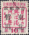| A single stamp set with a purple chop, although described in Kerr as a hard overprint all examples seen so far are soft and difficult to read. The translation is Limited for Use in Jilin-Liaoning. | ||||||||