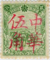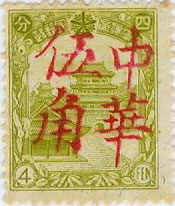 | This is a set of four distinctive red surcharges. The Surcharge of 50fen (5 chiao) is on the left, with 中華 China on the right. | ||||||||