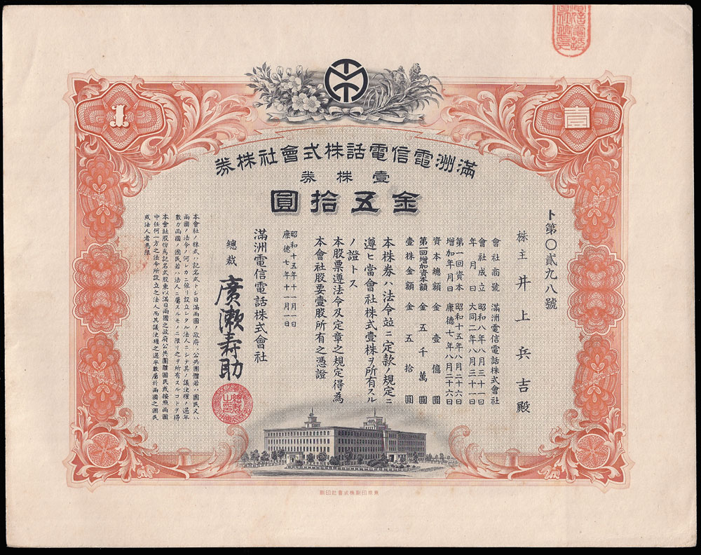 Original 1933 MTTC Stock Certificate (¥250, 5 shares) 1940 MTTC Stock Certificate (50Y, 1 share) The MTTC although described as a joint venture between Japan and Manchukuo was inevitably managed by and for the Japanese. To unify communication systems within Japanese controlled territories the company took control of existing telephone and telegraph networks and radio stations within Manchukuo. Radio stations were of obvious interest as a means of disseminating Japanese propaganda and culture. When the MTTC came into existence there were only three active stations Dairen which started transmission in 1925, Harbin which began broadcasting in 1926 and Mukden launched in 1928. In 1933 a new broadcasting station was built in the capital Hsinking. |
