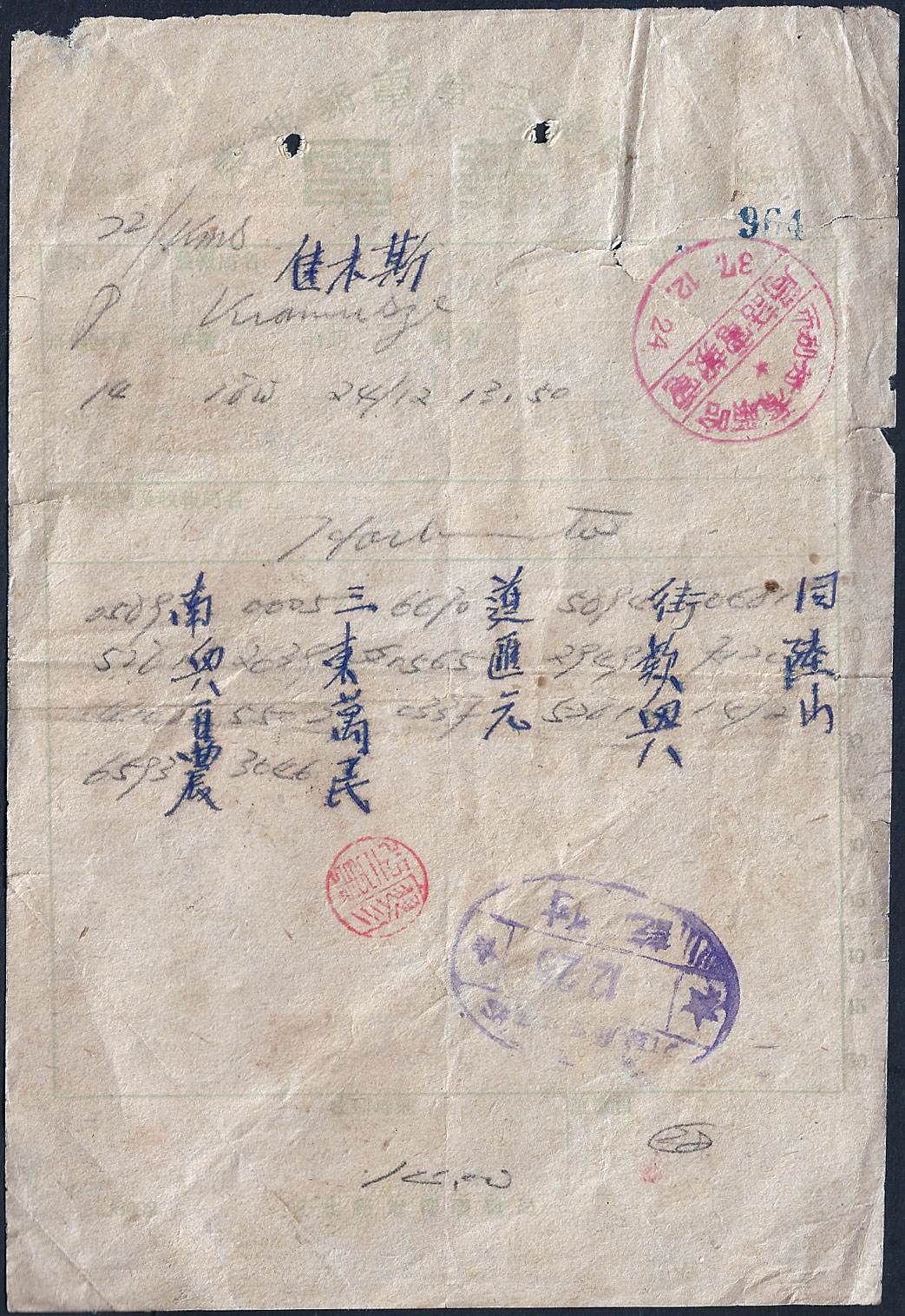 A faded copy of a telegram compilation sheet - 14 words Harbin to Jiamusi. Dated 1937 |