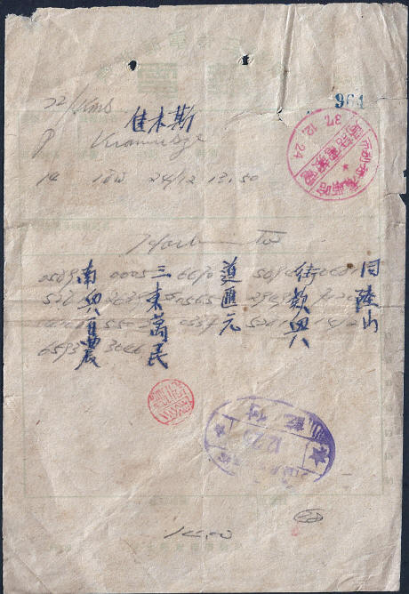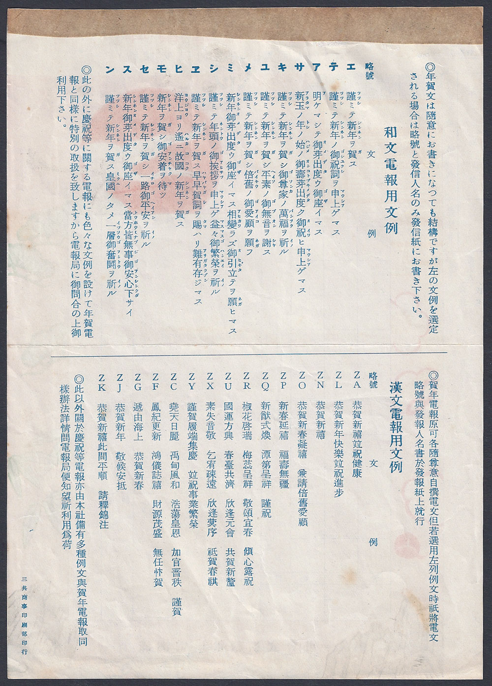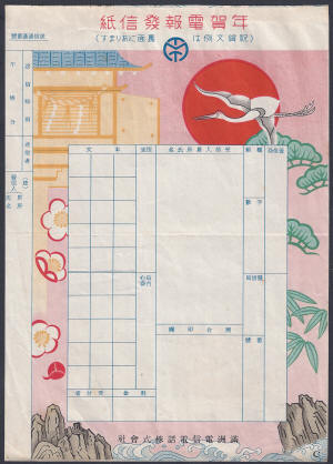 This is a special form designed to make it easy to send a New Year telegram. Note the MTT logo of the Manchuria Telegraph and Telephone Corporation top centre and see the 滿洲電信電話株式會社 imprint at the bottom. Dating this form is difficult as no dates are shown, the Manchurian crane, land separated by sea and symbols of Japan and Manchukuo all point to the time of the Emperors second visit to Japan in 1940, the stamps for this year also feature a Manchurian crane, hence the educated guess. The back of the form contains a list of 15 two letter codes, each relates to a standard New Year greeting. These are in Japanese and Chinese. The first ten greeting codes are for members of the public, the last five are designed for business use. The form also states "◎ Besides these sample greetings we have many others for all kinds of occasions, if you have any questions ask at your telegraph office". |