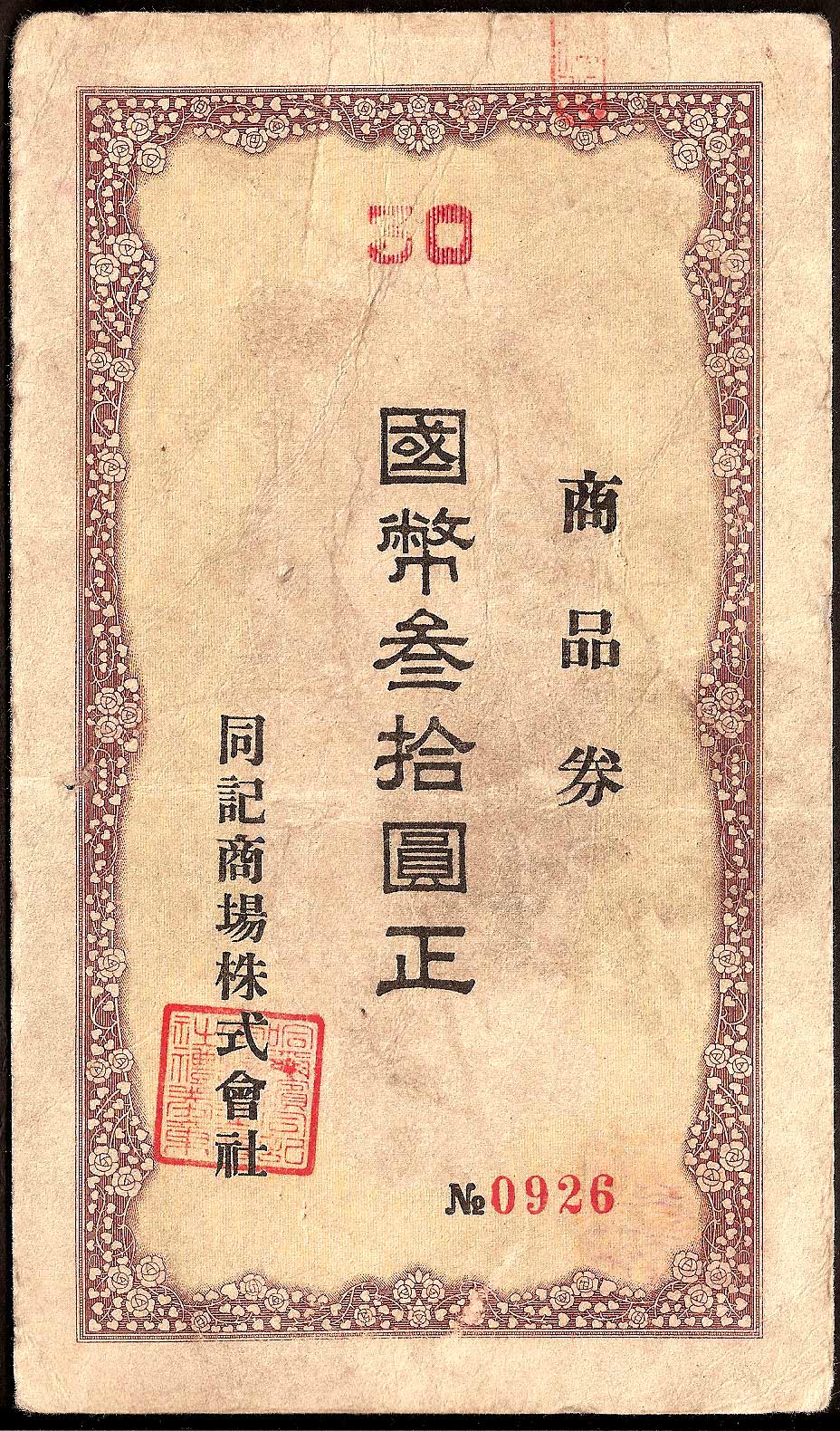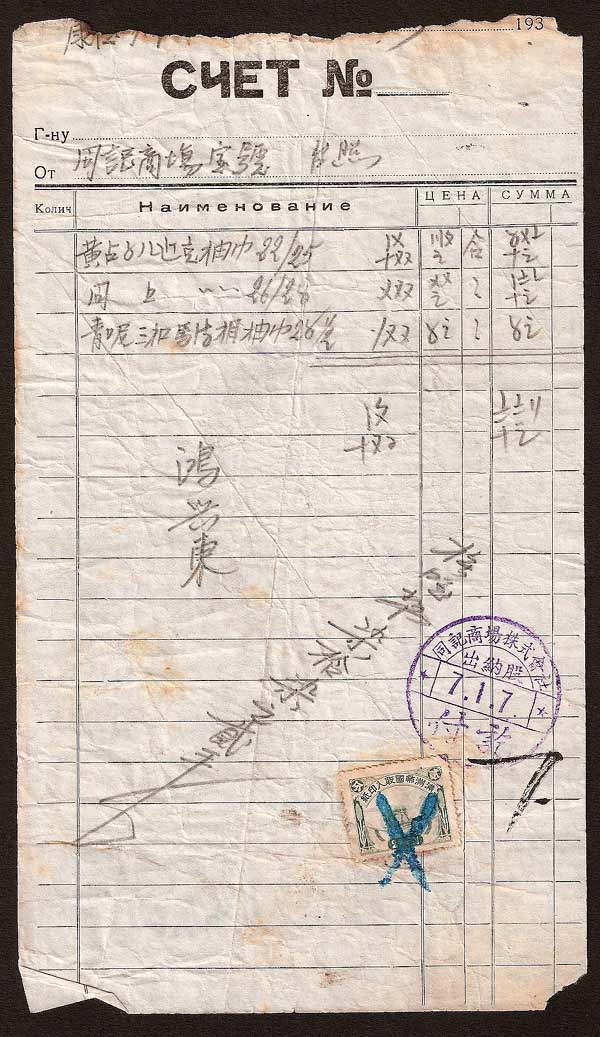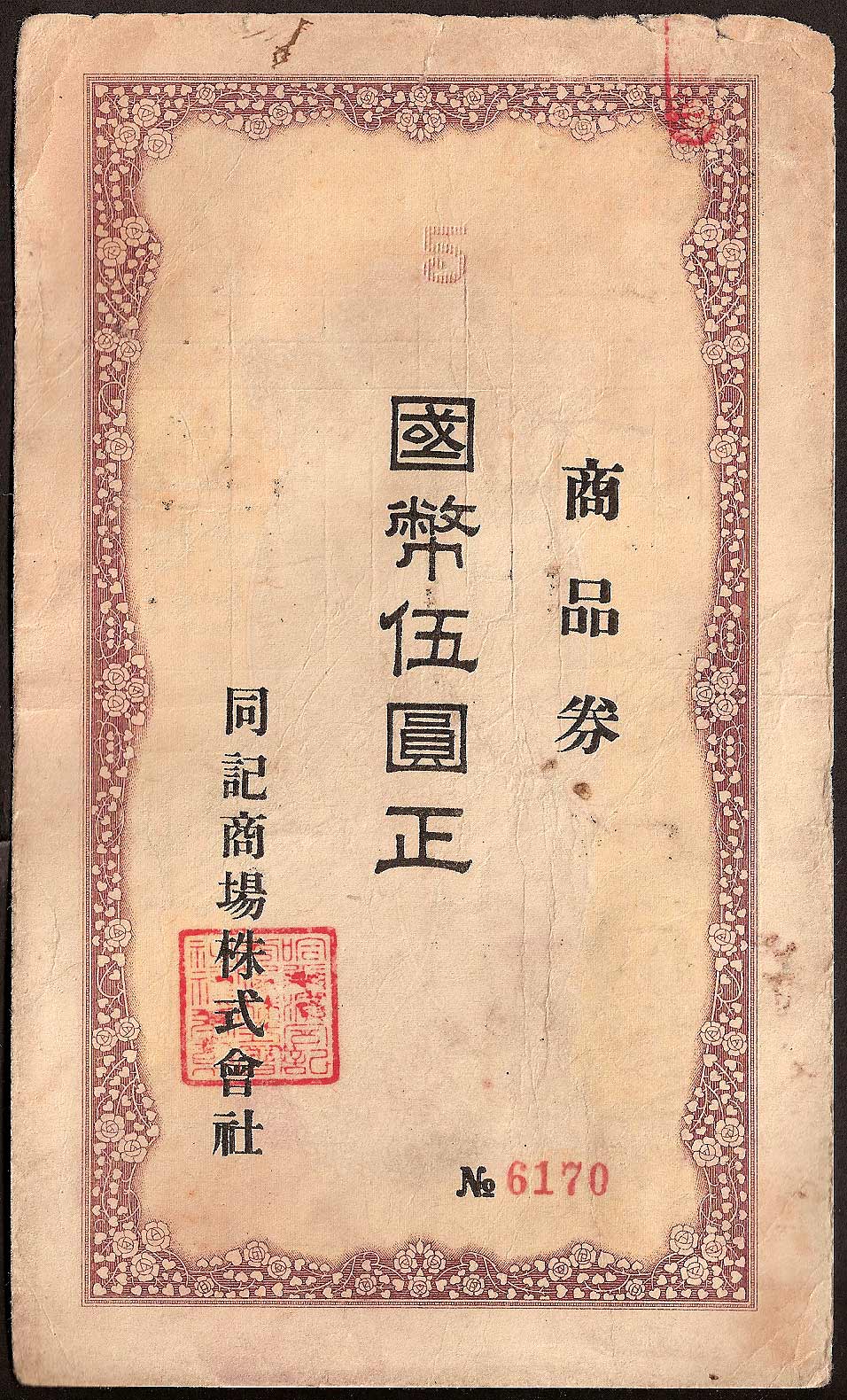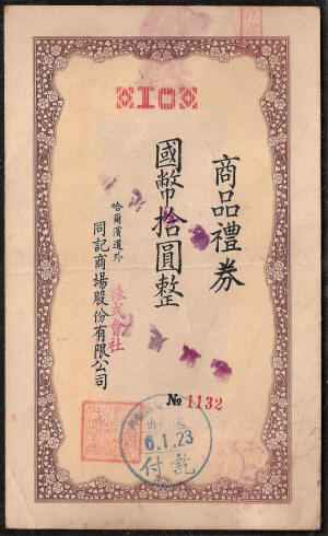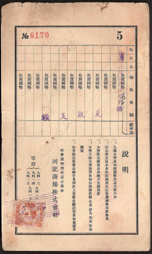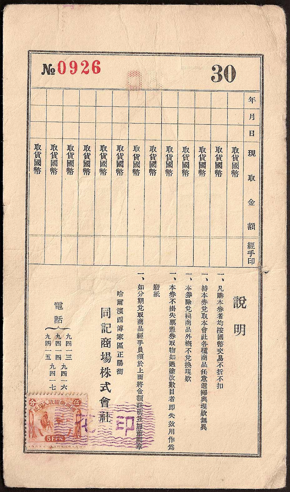 1936 Tongji Department Stores voucher with a 2f revenue stamp. This is interesting because it is a pre-occupation Minguo issue. The 中華民國 Chinese Republic year date is overprinted with rubber-stamp to read 大滿洲帝國康德 Manchurian Empire Kangde and the currency is in old silver changed in red-overprint to GUO BI, national currency, in this case Manchurian Yuan. |