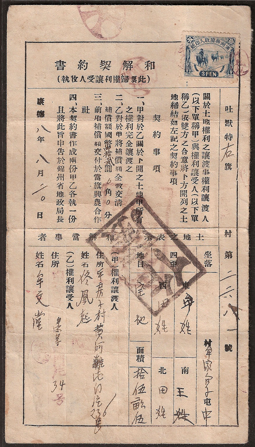 Manchukuo First Regular Issue Revenue Stamps on Paper First revenue stamps on paper are hard to find. Most are examples of purchase tax or court use. Shop receipt with two 1f "First" revenue stamps.