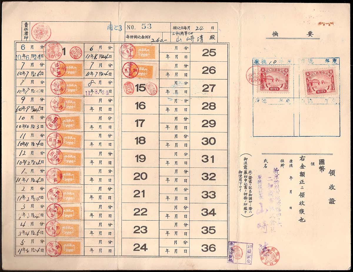 5f revenue stamps in use attached to an unused 30 Yuan Voucher, 10 Yuan Voucher and 5 Yuan Voucher dated 23rd January 1939 and 22nd April 1942, the size of these items is 116mm x 198mm and they are printed on thick paper with a watermark of four large characters. The vouchers were issued at branches the Tongji Department Stores, one of the largest retailers in Manchuria. 20Y and 50Y vouchers are also available. The revenue stamps are added when the voucher is issued and not when cashed, and there seems to be the same 5f stamp required for both values. Other values may be obtainable. The vouchers appear to have been issued in Harbin and Kirin and the numbering seems to be consistent with the dates of issue, ie; the lower the number, the earlier the date. Above is a fixed-savings-deposit, from the ZHI CHENG YINHANG, meaning the Bank of Zhicheng, dating from 1941. It is interesting to see that it was still valid after the war ended and the investor paid in 1946. Note the 3f revenue stamp. Above is an investment certificate with a face value of 10,000 Manchukuo Yuan issued by the Manchurian Industrial Bank. To realise the investment the customer was required to make a deposit of 260y each month for 36 months. Having made the monthly payments, a total of 9,360y, a sum of 640y would be added by the bank and the customer would have received a total of 10,000y. With the term completed the investment would have earned 4.5% over 3 years (or 1.5% p.a). It should be noted that the customer, probably a company, only completed 15 payments. My thanks to Neil Kaplan for this explanation. The Certificate shows a 3f revenue stamp on the face side, paid at issue, and seems to have attracted a 10f per annum charge while in use denoted by the 10f revenue stamps on the reverse side.
