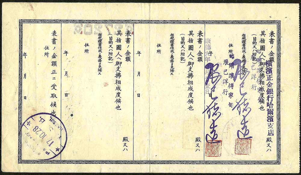 Manchurian Cheque with a 3f Revenue Stamp (to see the reverse click here). A promissory note from the Yokohama Specie Bank (presumably the bank is the lender). This is a short term loan, taken out Showa 17.9.14 and repayable Showa 17.10.28. with a 3f Revenue Stamp. The Tongji department store circular date stamp in blue, shows that it was repaid on time - Kangde 9.10.28 (to see the reverse click here).