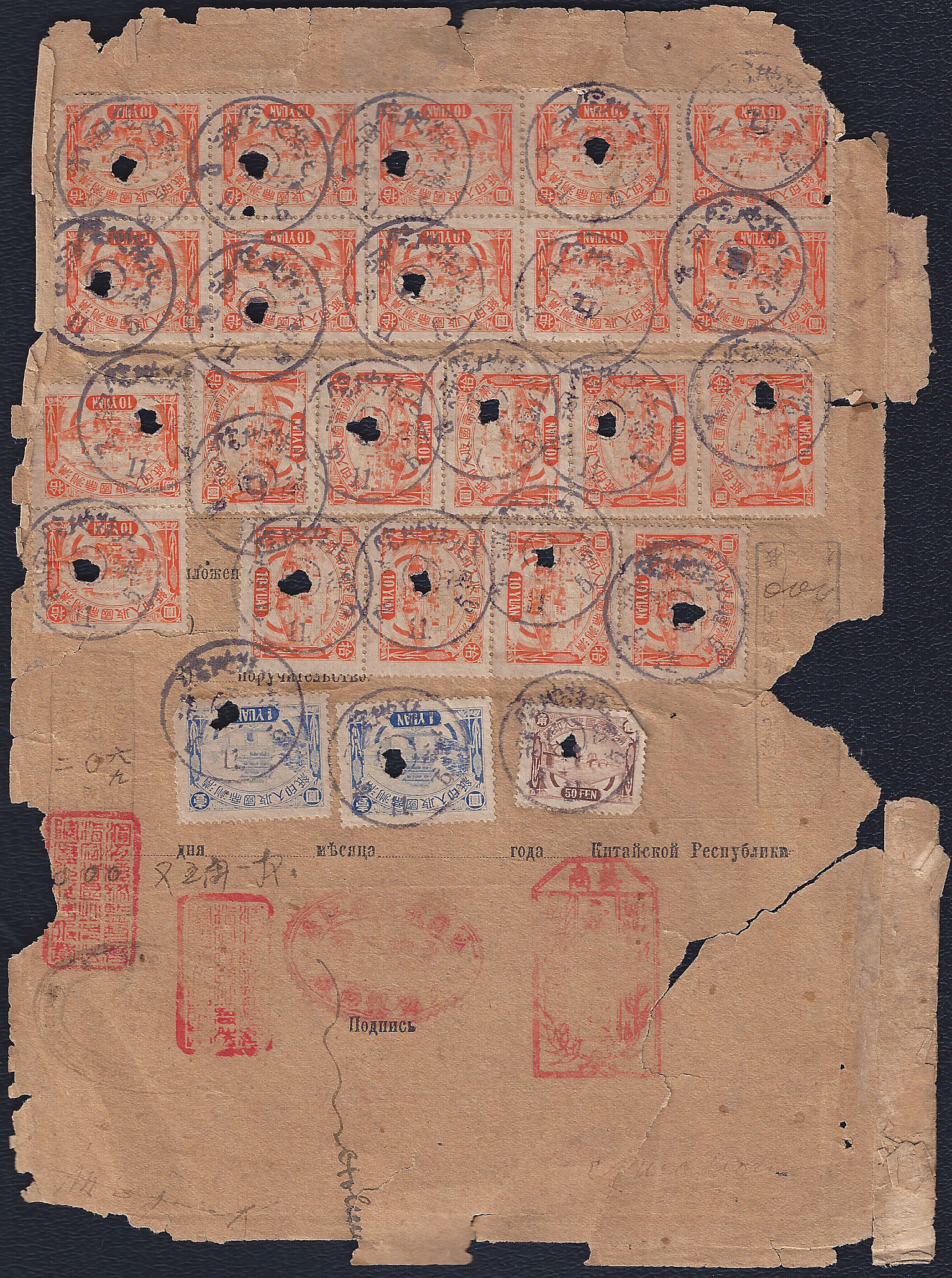 This is another Russian real estate document with stamps to the much higher value of Y212.50, again the stamps have been holed to prevent re-use. |