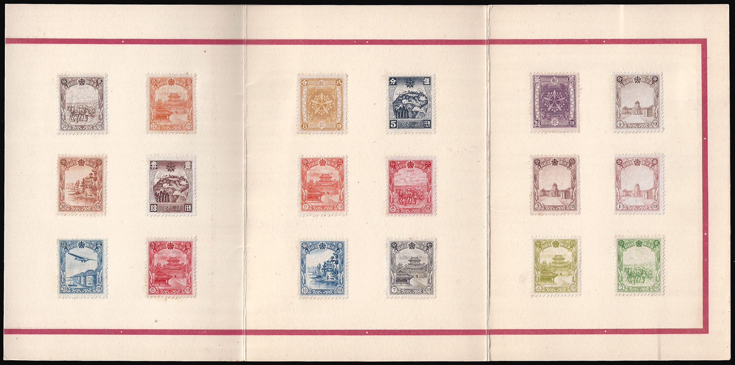 | The large seal script characters are repeated from the label on the cover and read 滿洲國郵票 Manchukuo Postage Stamps. | This page contains one each of the following - 1936 Fourth Regular Issue stamps ½f, 1f, ½f, 3f and 5f. Note - the 2f and 4f stamps are not included. | This page contains one each of the following - 1936 Fourth Regular Issue stamps 6f, 7f, 9f, 10f, and 13f. Note - 12f stamp is not included. | |||||||