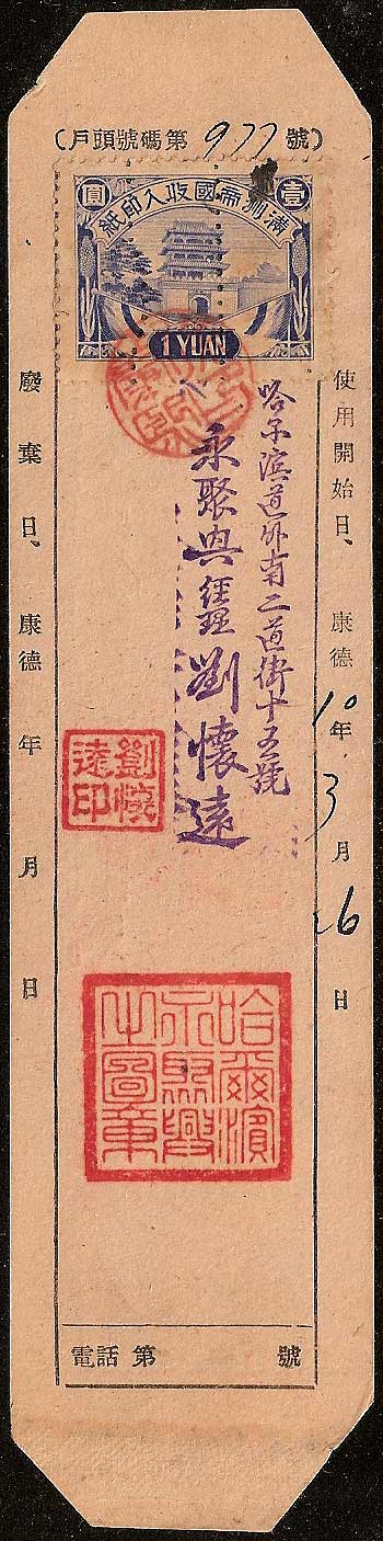 Fake Manchukuo Bank Document Many collectors like to find revenue stamps in use on an original document, this helps to put the use of the stamp into context and provides evidence for dating etc., This is great if the document is genuine, but misleading if the document is a fake or has been tampered with. The document shown below was sold on eBay as a Bank Document with a 1 Yuan revenue stamp. If you look carefully at the stamp however you will see a series of dotted lines running vertically, these lines are only on the stamp and do not continue onto the document itself. The dotted lines are typical of a stamp used on a court document suggesting that the revenue stamp had previously been used to pay a court fee before being added to the fake bank document. The black mark at the top of the stamp will hide a character. Between the dotted lines there are usually characters reading "Cancelled by Court". My thanks to Professor W T Chen for his help in the identification of this forgery. |