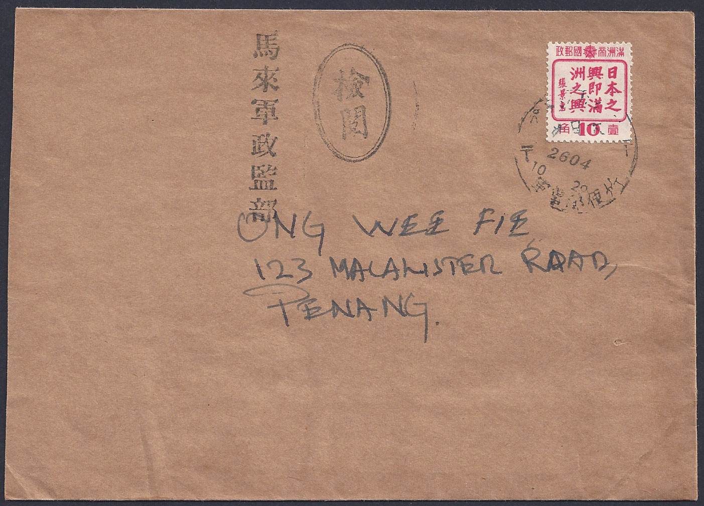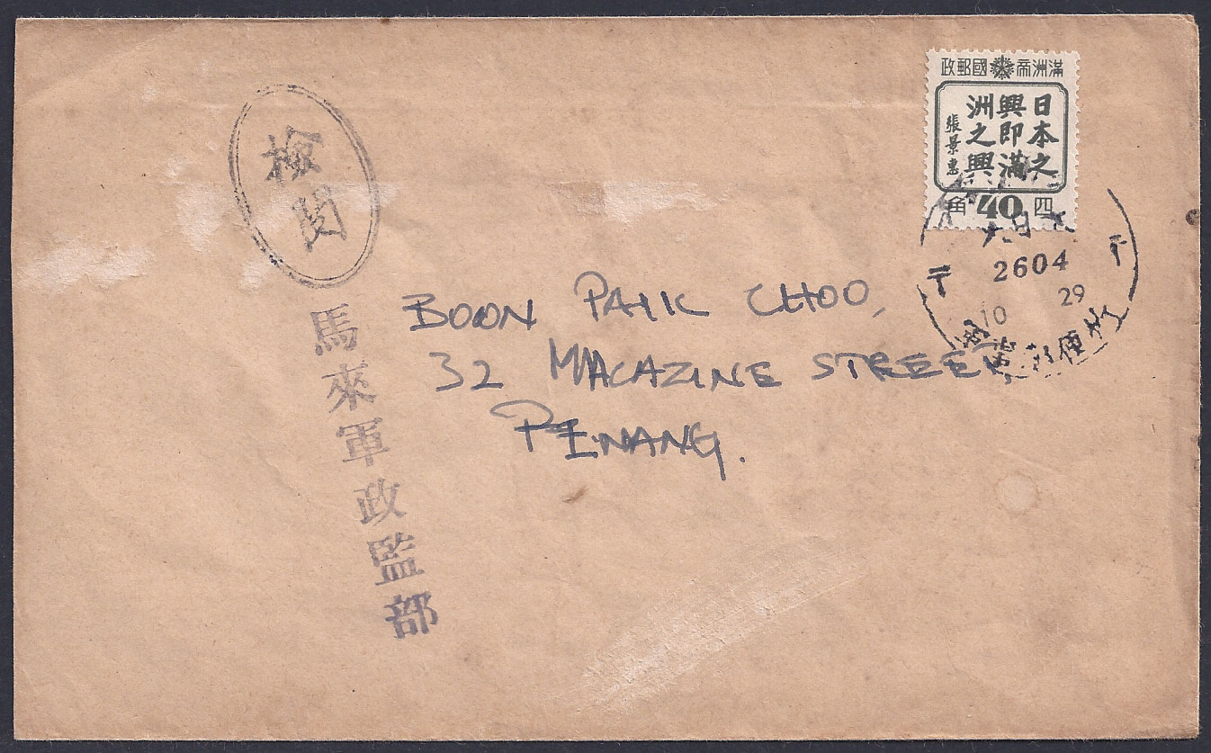Stamps of Manchukuo Used on Covers to Penang These are a very unusual fantasy items - covers with stamps from Manchukuo used within Malaya (Malaysia). It is thought that such covers appeared at the end of WWII in a range of forms. The use of stamps from Manchukuo in Malaya did not to my mind automatically rule them out, this is because Malay Post Office workers were used to stamps from Japan and soldiers may have travelled to the area from Manchukuo with stamps they wanted to use (although this is very unlikely). In this instance I had to ask the advice of expert collectors and members of the ISJP and the best summary came via Ken Bryson (ISJP Librarian) to whom I am indebted. He noted the following - "The cancellation is one that was used on the Thai-Burma Railroad at military post offices (gunji yūbinsho). Although indistinct the place name looks like プランカシー which was in fact one of these offices. These offices were manned by Malay personnel, who did send mail back to their colleagues and families in Malaya as seen in the illustrated pieces. However the “censor” mark doesn’t match the type apparently used at the rail line offices; the “Malay Military Government” rubber stamp doesn’t agree with the purported origin of the piece; the date font in the cancellation doesn’t match the date indicia on the genuine cancels, and one of the dates doesn’t align with the rest of the cancellation; also there are no receiving marks". So in short, these are intriguing and unusual 70 year old Fantasy items, I had a similar but less detailed summary from Richard Arent, also a member of the ISJP.
