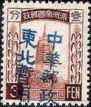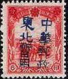 The following commemorative overprints appear on stamps printed by the Hsin Min press and surcharged with new values using a black typeface made up of Sung No 5 with additional characters reading Restricted for use in the North East. Due to wartime shortages the Hsin Min press were forced to use a variety of different papers to complete the contract and as a result more than one type of paper can be found for some of the stamps shown below. Type 1 - Newsprint