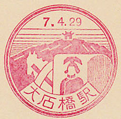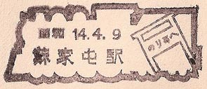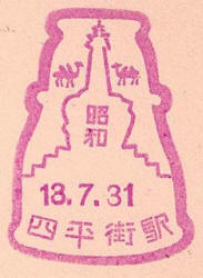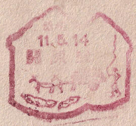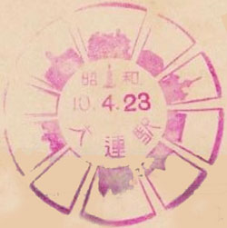 November 1936. Design features - The old walled city gate and an ancient monument. This cancel in unusual as most stations had updated to the new shaped cancels by this time. Size 43mm dia. Known colours - red-brown. |