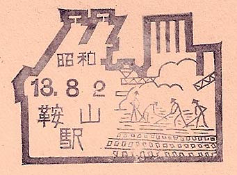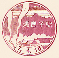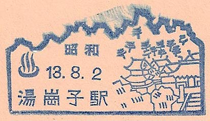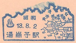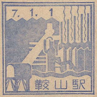 - Dated 2nd August 1938. Design features - A rural scene with the hot-springs symbol. T'ang-k'ang-tzu is close to Anshan. Design Size 50mm x 26mm . Known colours - blue and grey blue. |