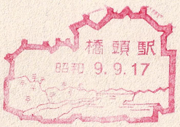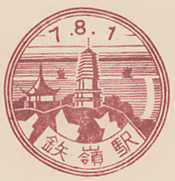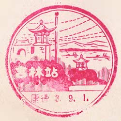 April 1939. Design features - A lion statue and part of the Great Wall with a rider on a donkey. The station name is also shown in Roman lettering, which is unusual. The "First Pass Under Heaven" is a notable tourist attraction, in Chinese this is 天下第一關 and appears in the top panel. It is the place where the Great Wall meets the sea. Design Size 53mm x 55mm . Known colours - red. |