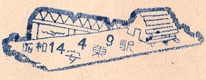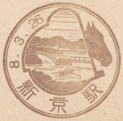 September 1939. Design features - A bridge and what I believe to be a hut on a raft of logs being transported on the river. I have seen this on postcards from Antung. Size 60mm x 19.5mm . Known colours - blue. |