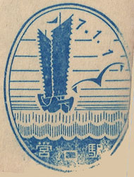 1932. The image shows a lug sailed junk which is often used as an emblem of Yingkow with a seagull in the foreground. Size 38mm x 50mm. Known colours - Blue |