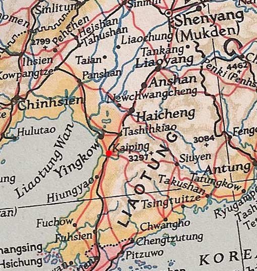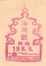 - Dated 3rd August 1938. Design features - the outline of a building, no doubt famous in Hai Cheng and a city scene. Design Size 28mm x 41mm . Known colours - red. |