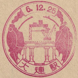 December 1931. Design features - the port of Dairen with a liner and a train reflecting the fact that Dairen was a major entry port and transport hub. Size 41mm dia. Known colours - Magenta and Blue |