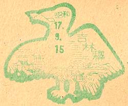 September 1942. Design features - Pictures of the city roofline in an outline shape of Hsinking. Size 33.5mm x 42mm . Known colours - purple and magenta. |