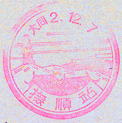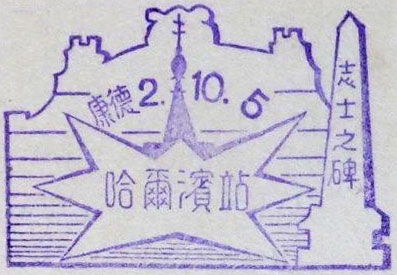 September 1936. Design features - Ships on the river and a view of a shrine and countryside. The dating is Manchukuoan (康德 Kangde 3). The date 1st September 1936 coincides with the release of the Manchukuoan postal scenic Cachets, this is probably not accidental. Size 45mm. Known colours - magenta |