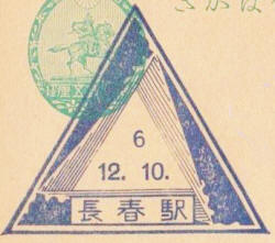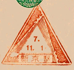 November 1932. The striking art deco design shows a triangle made up of three trains. This is the updated version showing the new city name of Hsinking. Size 40mm each side. Known colours - Red |