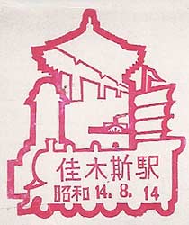 December 1933 (Note 大同 Datong Year Date). Design features - A pagoda pagoda with houses in the foreground. On the skyline are the chimneys perhaps connected to the famous Fushun colliery. Size 45mm. Known colours - magenta |