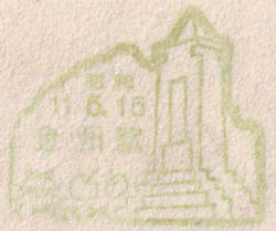 - Dated 15th May 1936. Design features - a war memorial with cherries and a building, probably the city gate. An enhanced copy of this image can be seen here. Design Size 40mm x 32mm . Known colours - green and violet. |