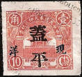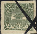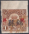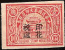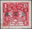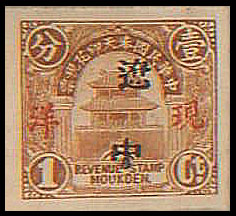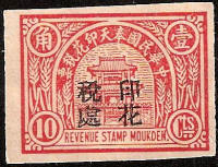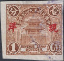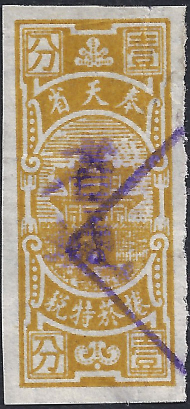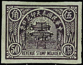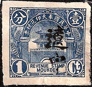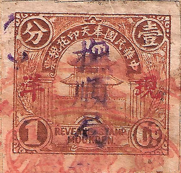 smaller version. The design features the Drum Tower bordered by wheat stalks. The top banner reads 中華民國奉天印花税票 “Republic of China Mukden Revenue Stamp” (the Chinese text reads from right to left). The stamps are overprinted with four characters in black 印花税處 “Stamp Tax Office. (Wetterling translates this as “Stamp Duty Office”). I doubt that this stamp exists without an overprint. |