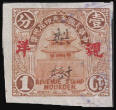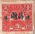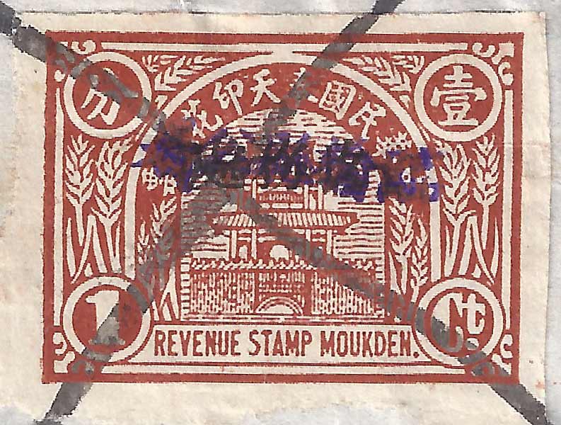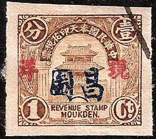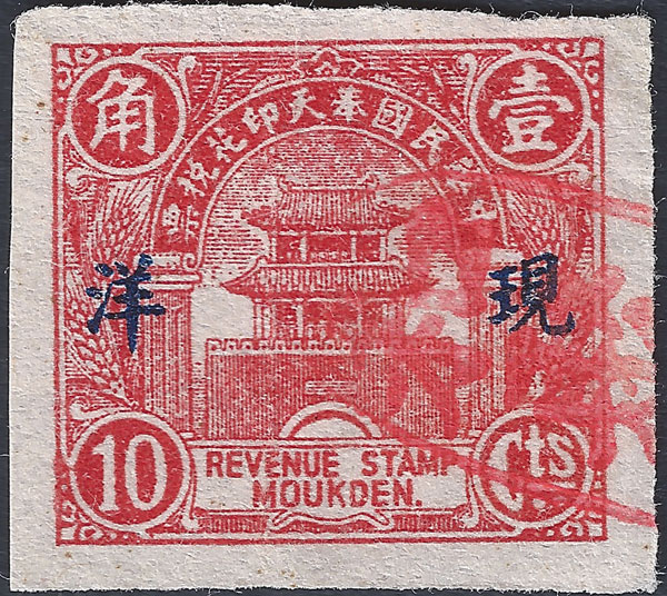 September 1931 These stamps had a different heading in the banner 奉天印花税票 "Fengtian Revenue Stamp" with a script Fengtien instead of Revenue Stamp Moukden at the base. After the Japanese Occupation, and before the formation of Manchukuo, there existed a Japanese controlled Fengtian Maintenance Committee for Local Autonomy, it is probably during this period that this stamp was in use. This would explain the dropping of the 中華民國 Republic of China from the banner. This stamp also has the overprint 現详meaning "cash silver" in black. |