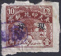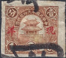 Known Values - 1c Blue, 2c Green and 10c Red Engraved, Size 21mm x 19.5mm on thin un-watermarked paper, always imperf. Engraved Litho For identification of the early 2f look for the straight lines in the background and a break in the character 花 Huā. This appears on both the 1c, 2c and 10c stamp. Note that the background behind the drum tower gate is also shaded from the roofline upwards and this stamp is slightly larger than the following litho printings. In this version only the 10c appears to be overprinted with 現详Cash Silver (in blue). |